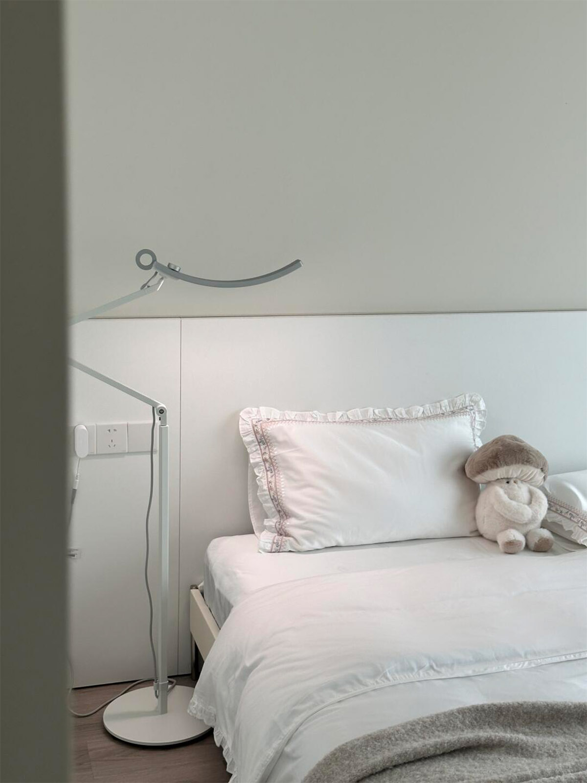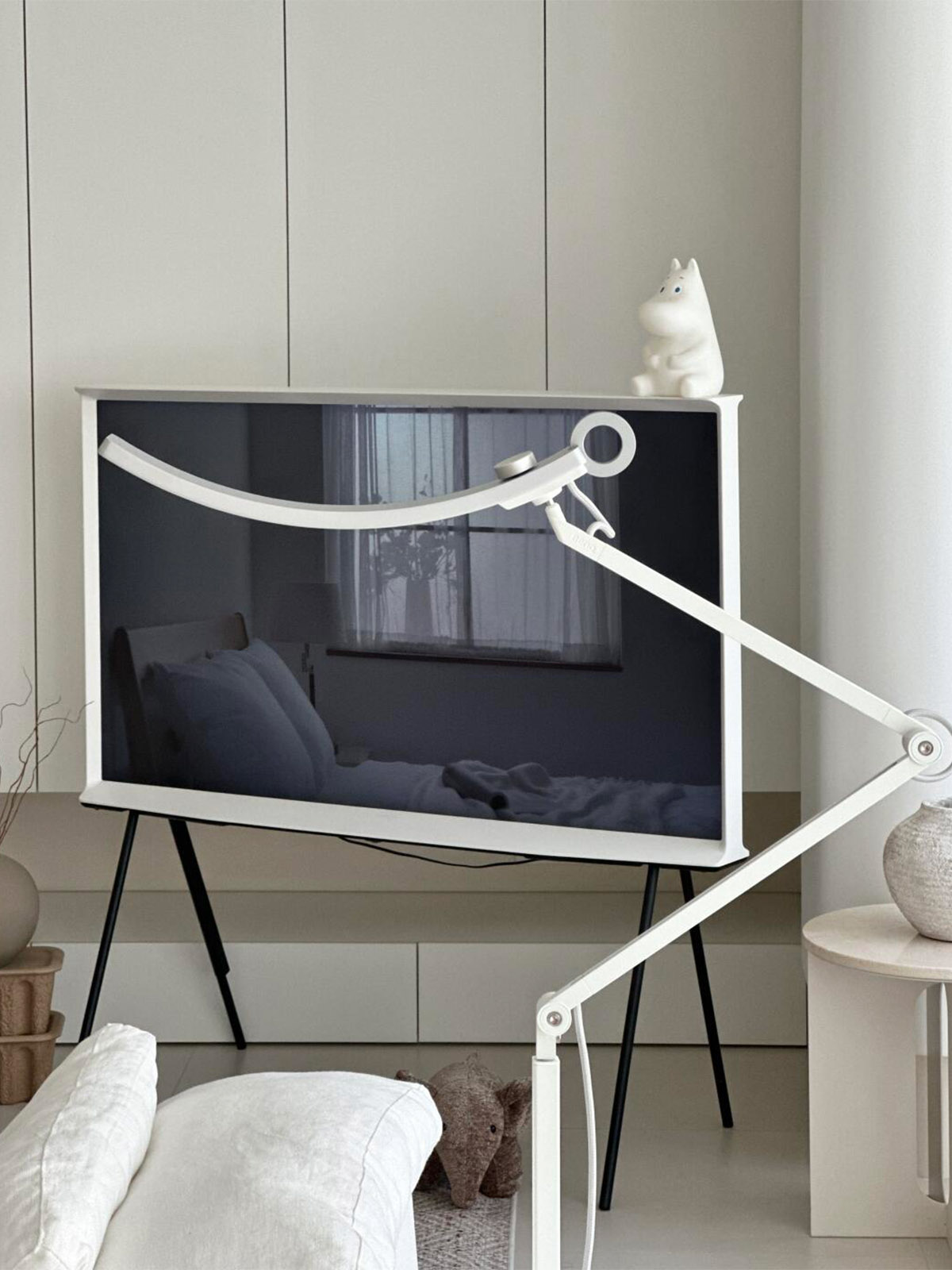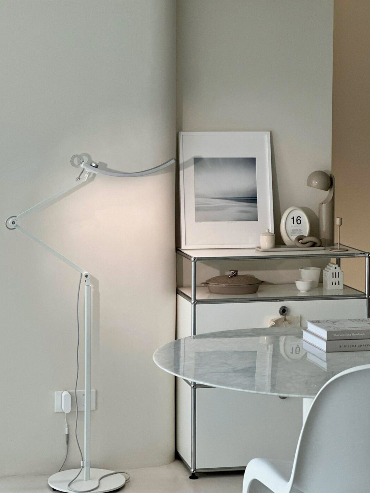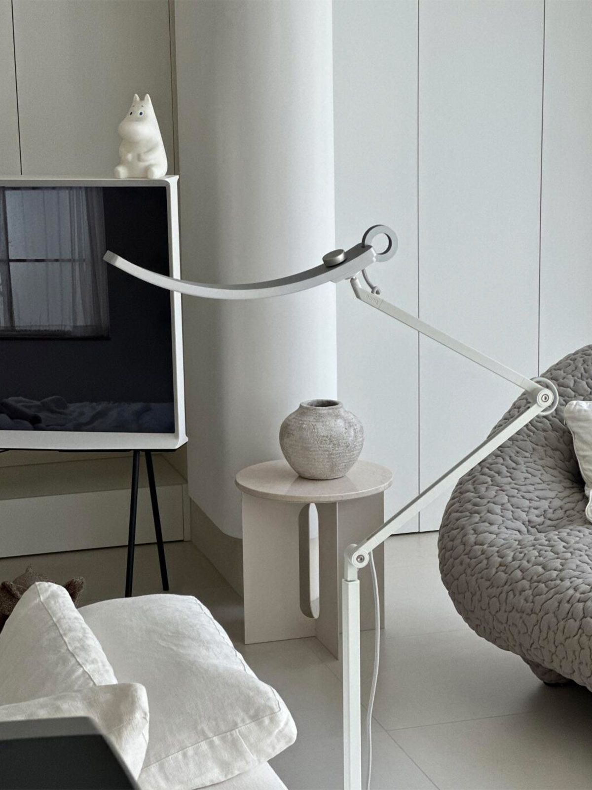 首先是光。我选择了专业的阅读灯,明基的这款落地灯光照范围足够大,明亮且均匀,书本和屏幕都不会反光或过暗。不管什么时候坐下来,光线都在那里安静等待,不用反复调试,就能轻松被包裹在最自然舒适的光线中。形态也很是我的审美,不过度设计,简单一盏,放在哪里都合适。
