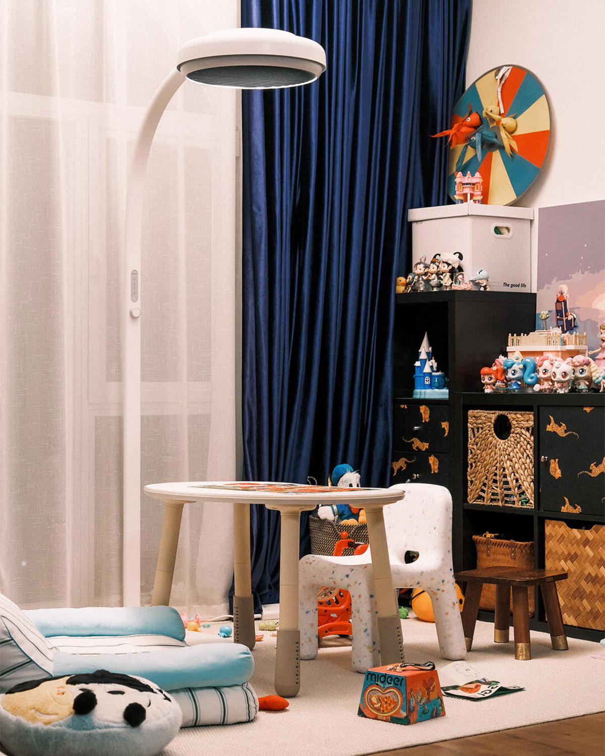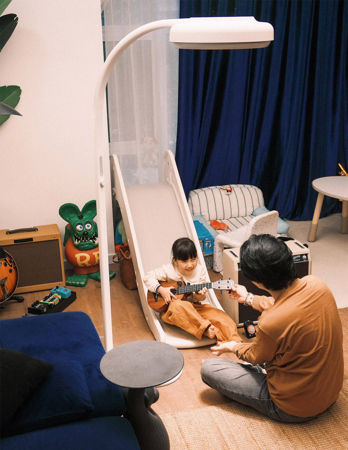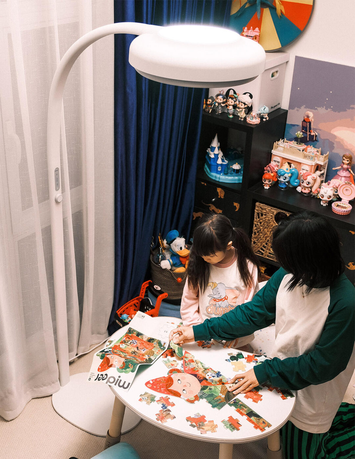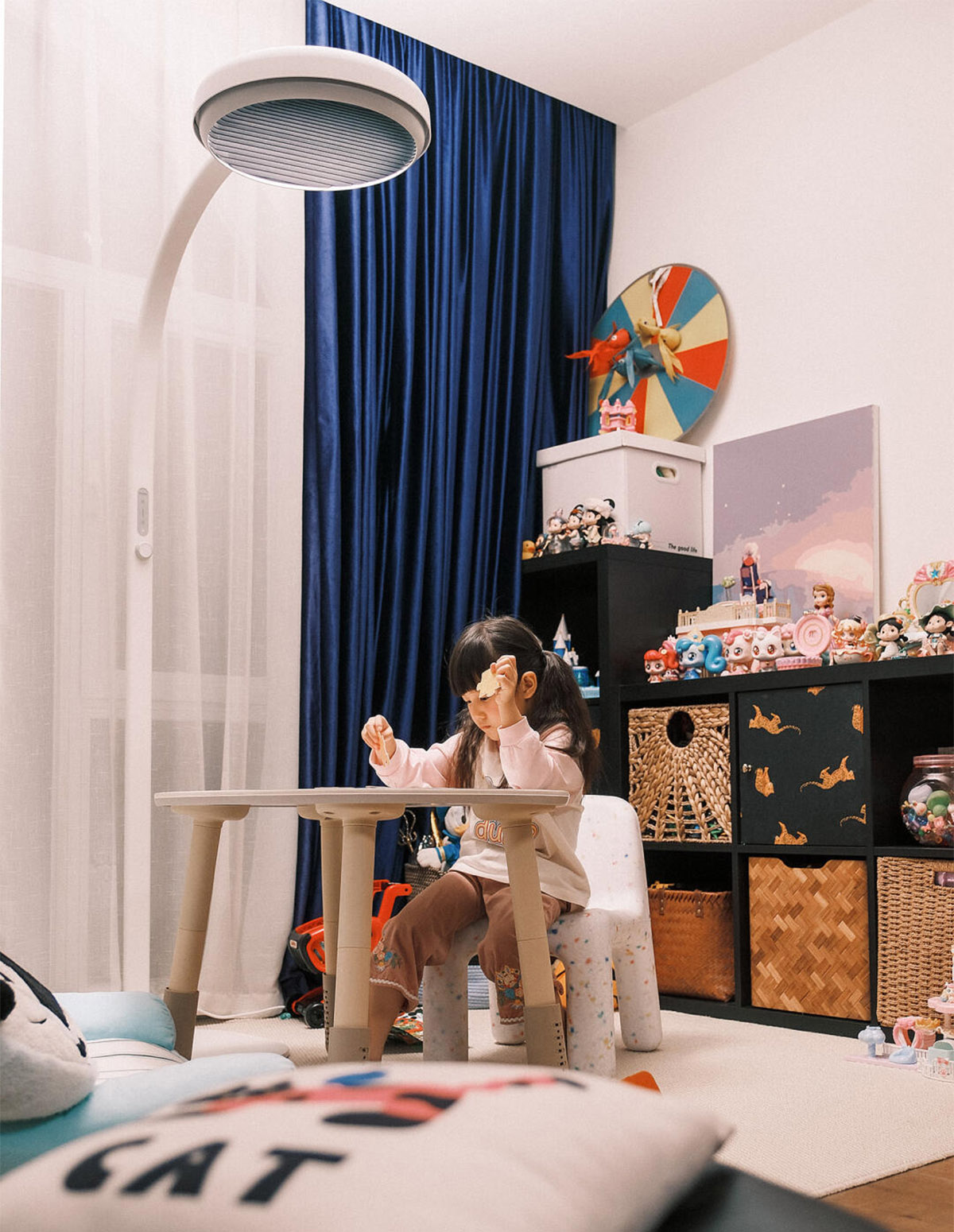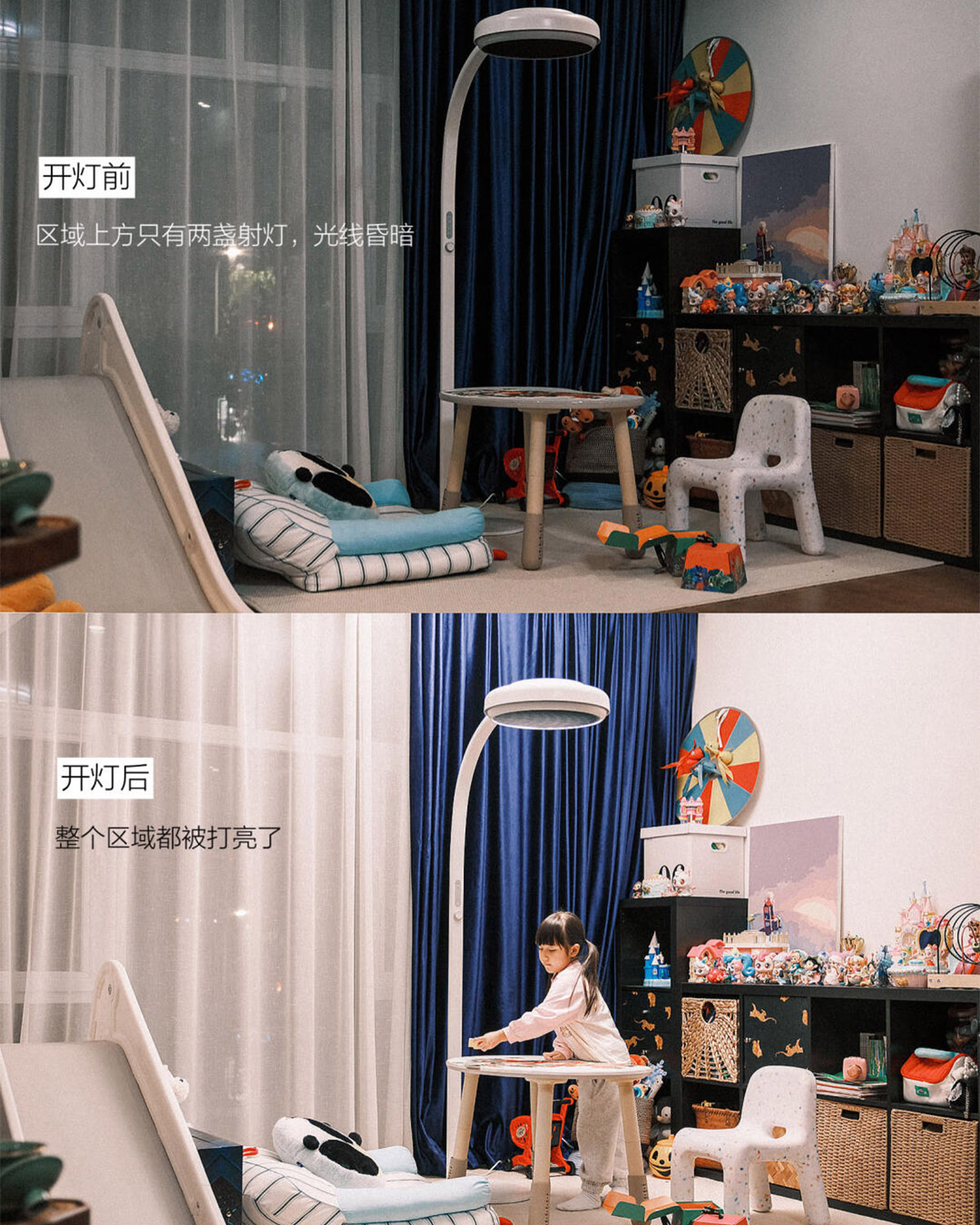 也喜欢麦朵尔亲子大立灯微微弯腰的姿态——灯头微微下弯向前伸展,正好把光均匀铺满她的小天地,向上的漫反射也让整个区域柔软明亮。