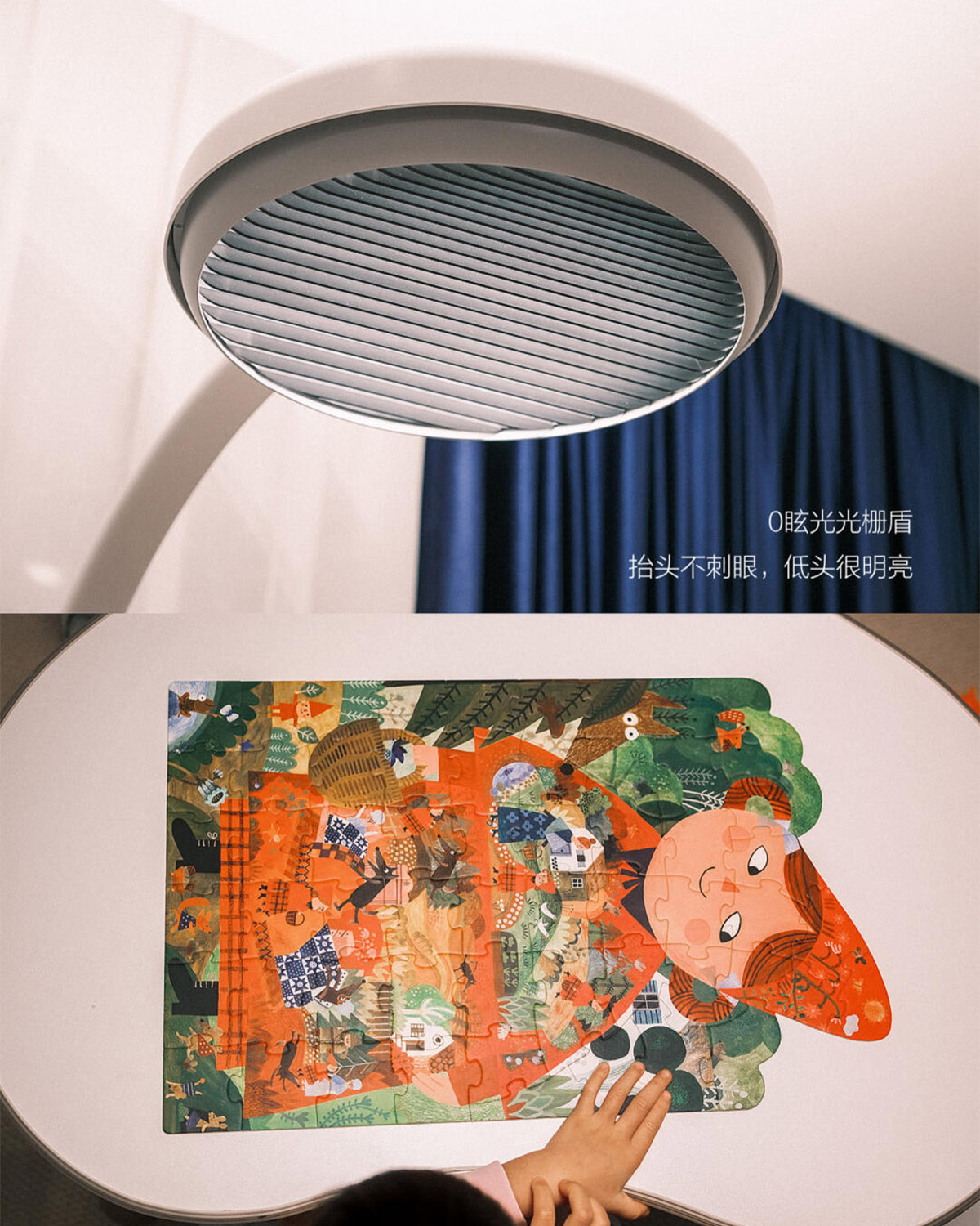 现在,好动的小人儿在客厅无论怎么活动,抬头都不会被灯光刺到——后来才知是0眩光光栅盾的功劳,50°超大遮光角能彻底屏蔽刺眼眩光。低头看拼图时、动手涂鸦时,完全没有手影,色彩鲜艳,再不会掩盖丰富画面里的小细节。
