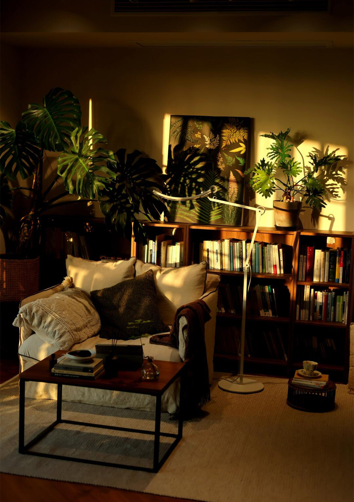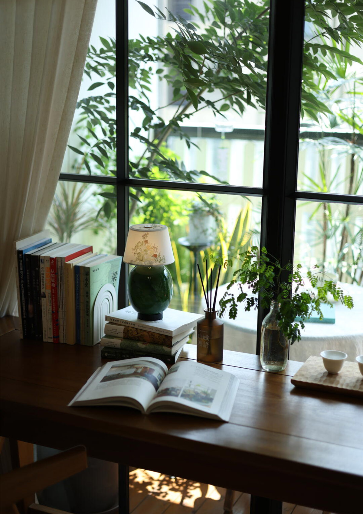 窗边的角落和书架上都摆满了绿植,一派生机勃勃的模样,悄然地将自然的清新揉进了阅读的氛围里。