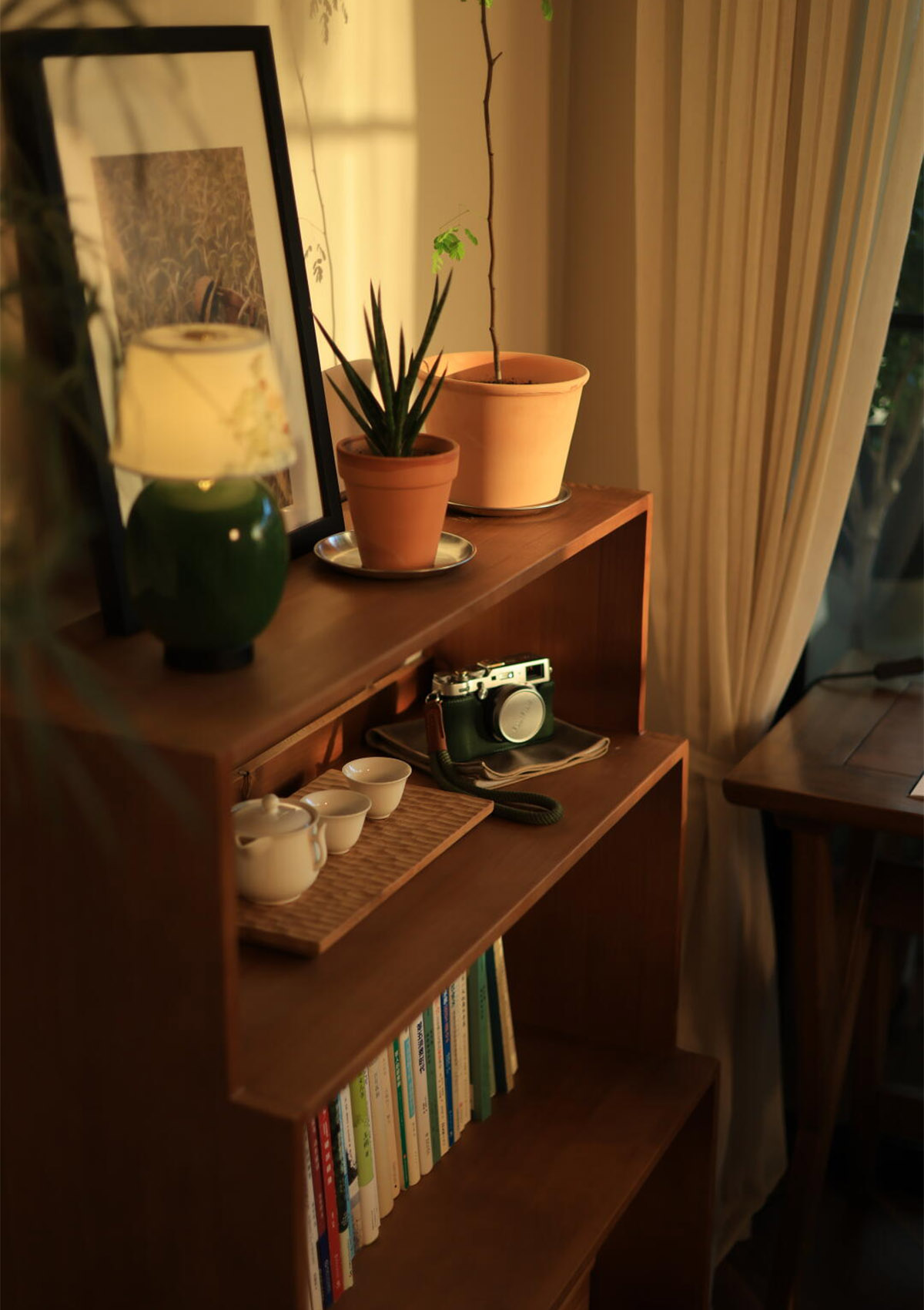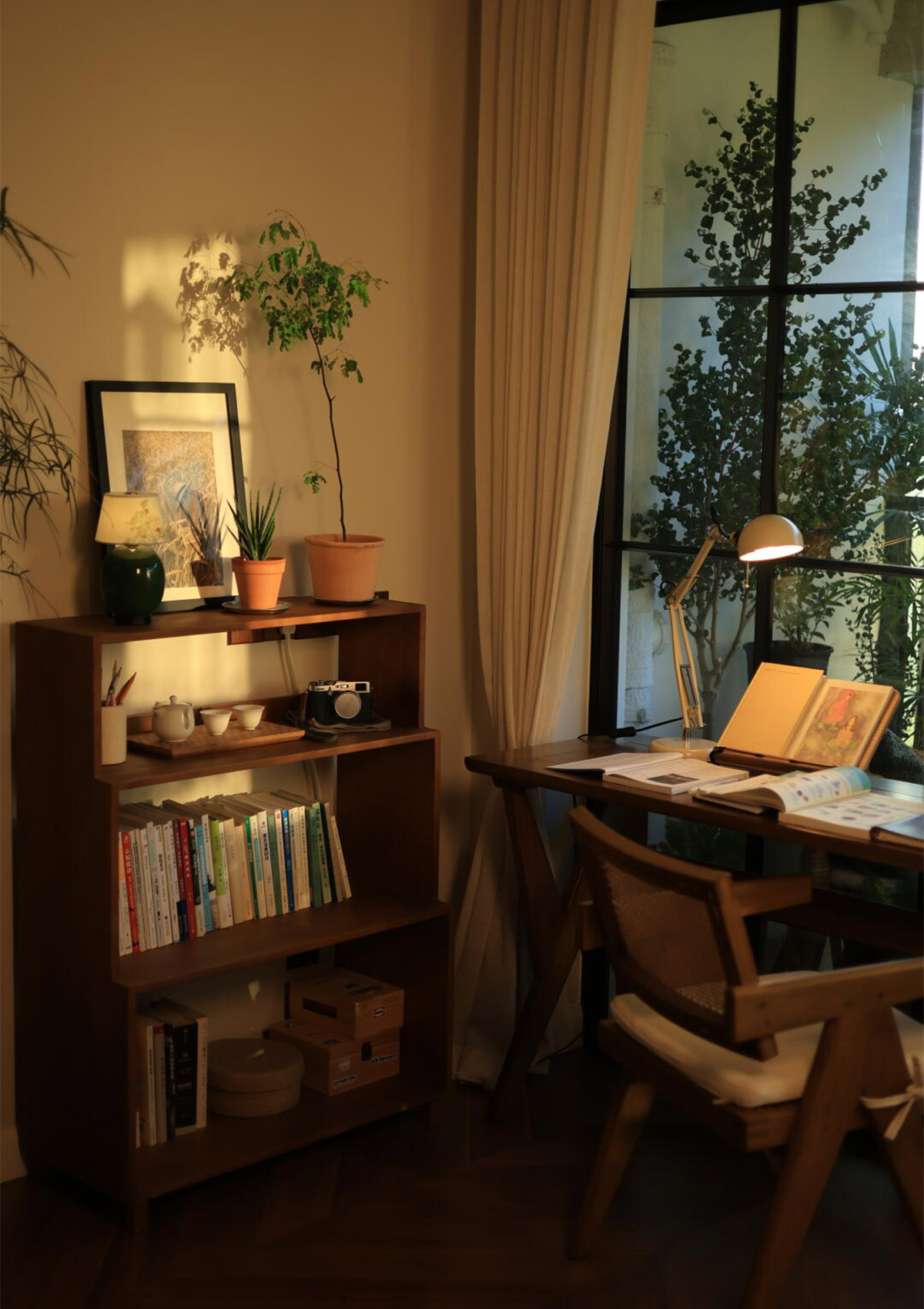 复古温润的木质书架,与书籍、绿植相互映衬,尤其在晴天,阳光穿过叶片的缝隙,在书架上投下斑驳的光影,氛围感瞬间拉满。