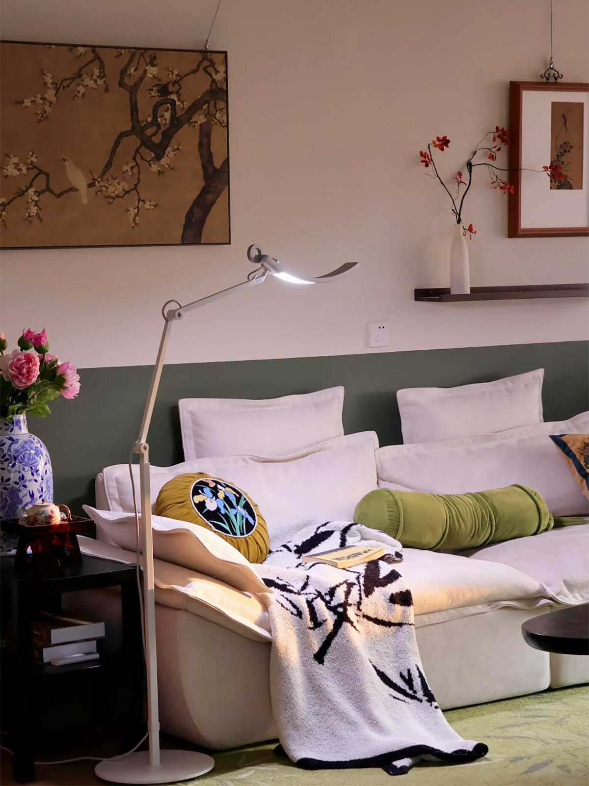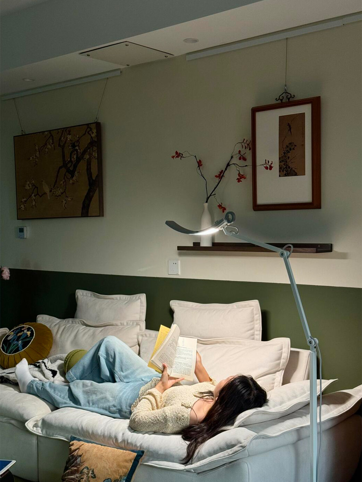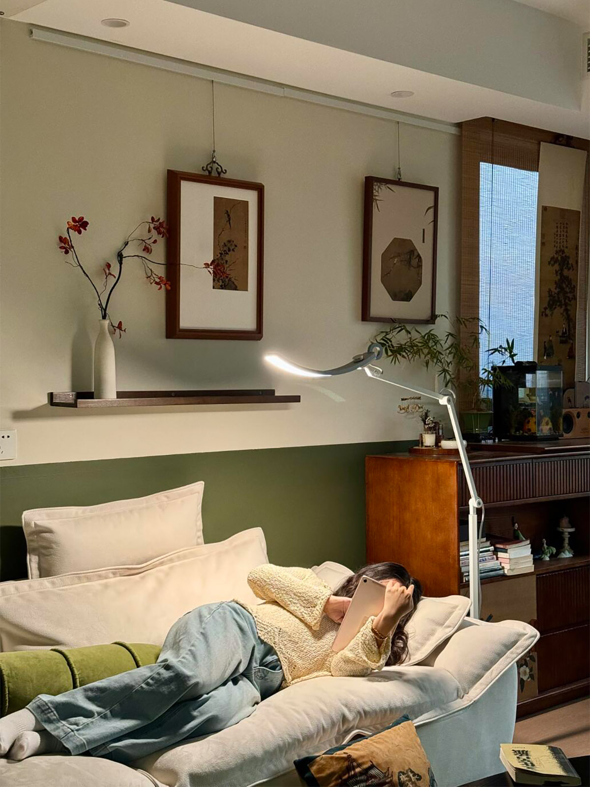 追剧时把光调成月色,灯臂微微俯身,像在和我一起看剧中人的悲欢。在这个被光包裹的角落里,连时光都变得柔软。