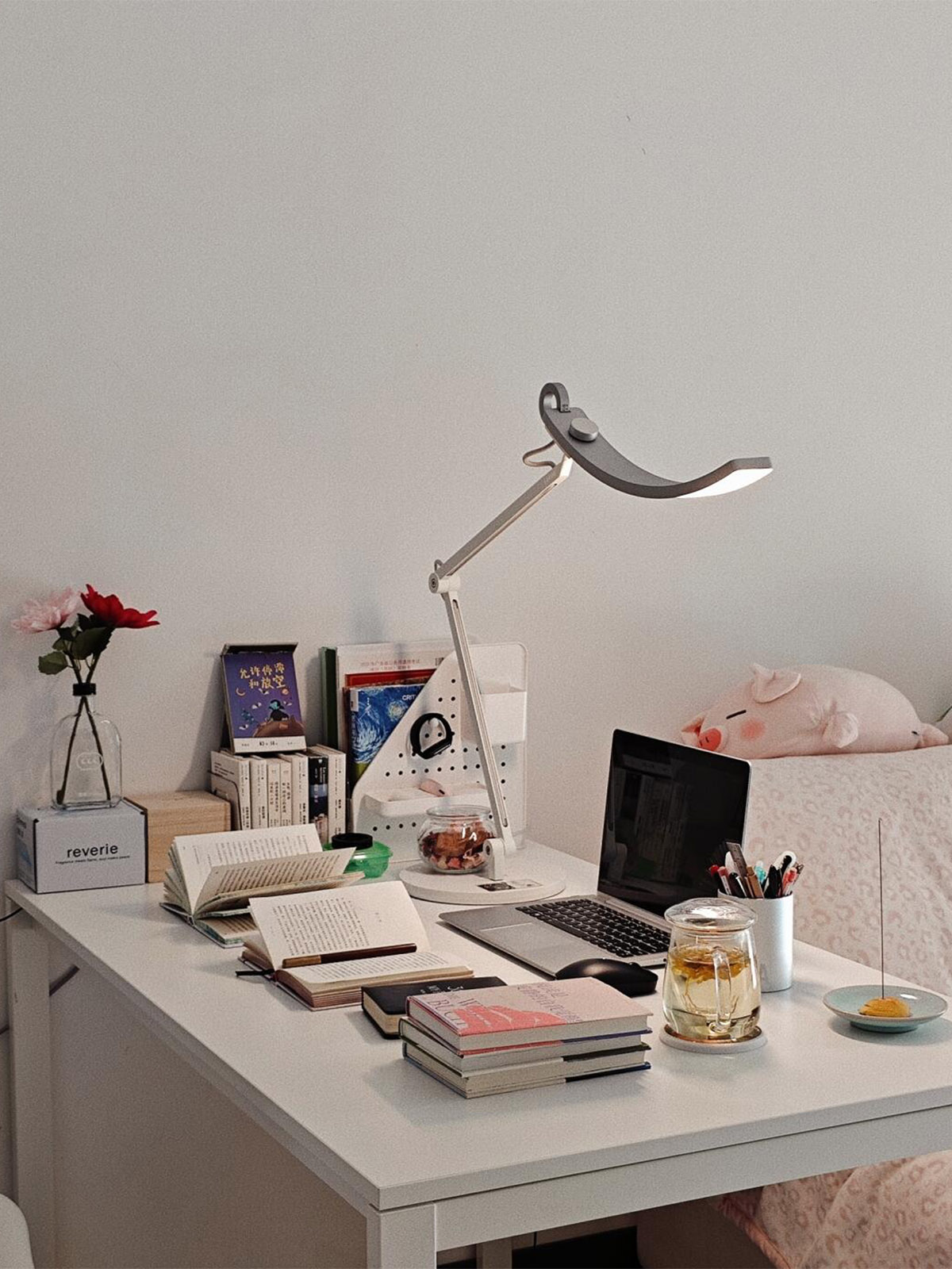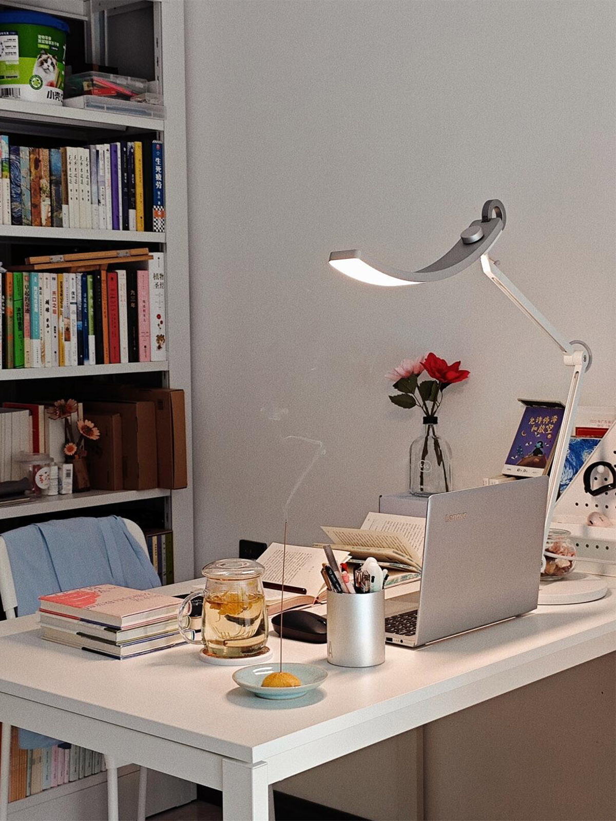 而且它的灯头能360度灵活弯转,想照屏幕、照零食盘都能调,不用摸黑找吃的。弯月的造型,厚实的底座,质感的银白色。摆在书桌上,像把傍晚天边那抹最软的月色截了一段下来。