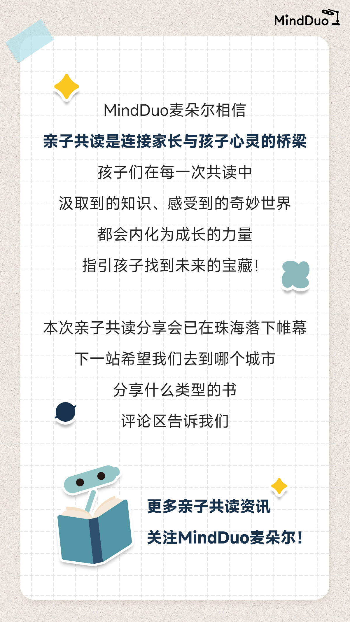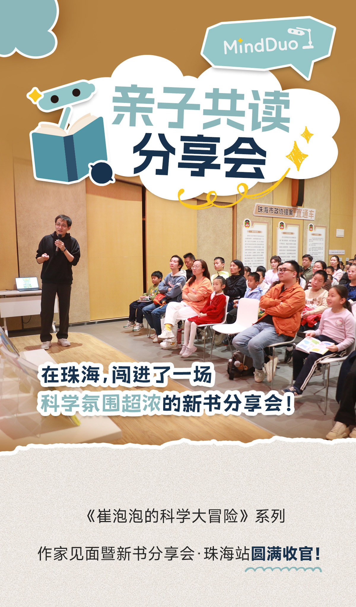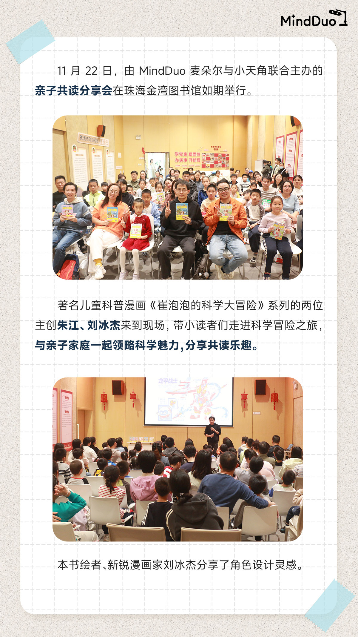 由MindDuo麦朵尔与@小天角童书 联合主办的亲子共读分享会,11月12日在珠海金湾图书馆如期举行。著名儿童科普漫画《崔泡泡的科学大冒险》系列的两位主创朱江老师、刘冰杰老师,现场带领小读者们走进科学冒险之旅,与亲子家庭一起领略科学魅力,分享共读乐趣!